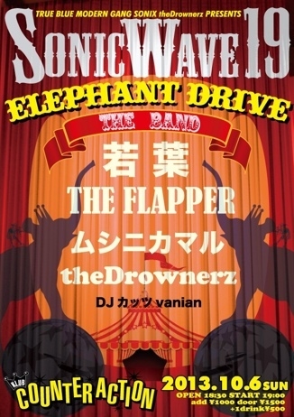 TRUE BLUE /modern gang sonix the Drownerz PRESENTS SONIC WAVE. VOL.19 " ELEPHANT DRIVE " 2013/10/6 (Sun) KLUB COUNTER ACTION open 18:30 start 19:00 1000/1500 出演 ムシニカマル 若葉 THE FLAPPER the Drownerz DJ カッツ