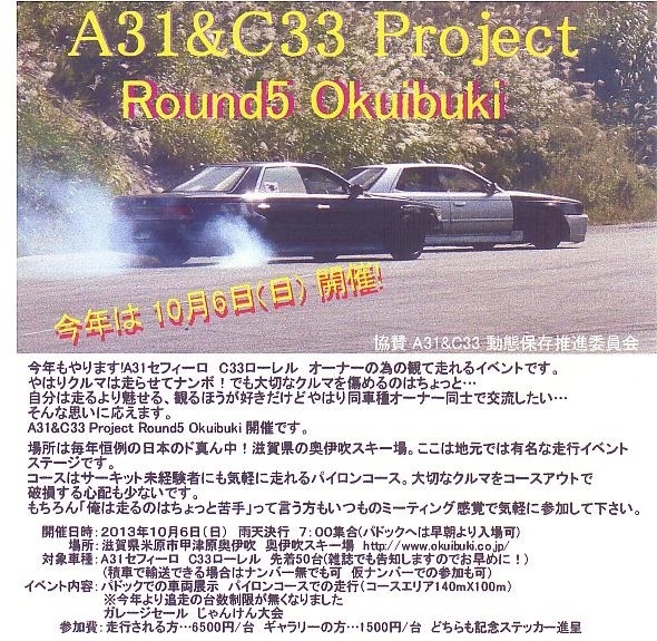 º£Ç¯¤â³«ºÅ¤·¤Þ¤¹¡ª ¹±Îã¤Î A31&C33 Project Round5 Okuibuki º£Ç¯¤Ï£±£°·î£¶Æü¡ÊÆü¡Ë¤Î³«ºÅ¤Ç¤¹¡£ ¡Ê²ñ¾ì³ÎÊݤÎÅÔ¹ç¤Ç£±£°·î£³Ï¢µÙ¤ÎÃæÆü¤ò³ÎÊݤǤ­¤Ê¤¯¤Æ¤¹¤ß¤Þ¤»¤ó¡Ë Âоݤϴ°Æ°¤Î£Á£³£±¥»¥Õ¥£¡¼¥í¤È£Ã£³£³¥í¡¼¥ì¥ë¡£ ÀѼ֤ǤÎÍ¢Á÷¡¢²¾¥Ê¥ó¥Ð¡¼¤Ç¤Î¼«Áö¤¬¤Ç¤­¤ë¤Ê¤é¤Ð¥Ê¥ó¥Ð¡¼ÅÐÏ¿¡¢¼Ö¸¡¤Î̵ͭ¤ÏÌ䤤¤Þ¤»¤ó¡£¡Ê¤¿¤À¤·Åô²ÐÎà¤ÎÊݰÂÁõÈ÷¡¢À©Æ°ÁõÃÖ¤ËÌäÂ̵꤬¤¤¤³¤È¡Ë »²²ÃÈñ¤ÏºòǯƱÍÍ¤Ë Áö¹Ô¤µ¤ì¤ëÊý¡Ä£¶£µ£°£°±ß Ÿ¼¨¤Î¤ß¤ÎÊý¡Ä£±£µ£°£°±ß ¤Ç¤¹¡£ ¤Ê¤ªº£Ç¯¤Ï¡ÖÄÉÁö¤ÎÂæ¿ôÀ©¸Â(£³Âæ)¡×¤¬Ìµ¤¯¤Ê¤ê¤Þ¤·¤¿¡£ »²²ÃɽÌÀ¤Ï¤³¤³¤Ø½ñ¤­¹þ¤ß¡¢