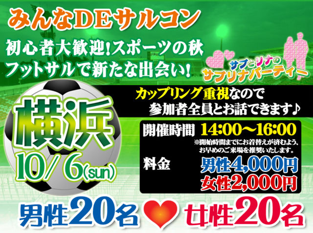『横浜 みんなDEサルコン』 〜〜〜話題のサルコンのお知らせです〜〜〜 10月6日(日)14:00〜16:00 ※13:30〜受付開始 場所:横浜国際コート ●JR横浜線小机駅下車徒歩3分 募集人数 ◎男性:20人 ◎女性:20人 (最少催行人数 男性:8人 女性:8人) 参加資格:男女ともに20歳以上(独身に限る) ※身分証明書の掲示が必要な場合がございます。 参加費用 ◎男性1名:4,000円 ◎女性1名:2,000円 【服装、シューズについて】 フットサルウェアまたは動きやすい服装で結構です ロン