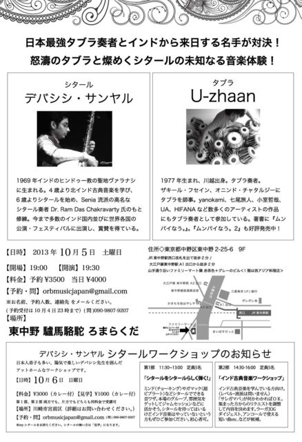 10月に来日するシタール奏者デバシシ・サンヤルの シタールワークショップがあります! インドの聖地バラナシで、多くの日本人にシタールを教えている方です。 旅行のついでにシタール習ってみたい人にもおすすめですよ。 あまり構えずに、気軽に参加OKです! --------------------------- 日本人弟子も多い、陽気で楽しいデバシシ先生を囲んだ アットホームなワークショップです。 【日時】10月6日 日曜日 【料金】\3000(カレー付) 【見学】\1000(カレー付) 第1部、第2部 両方でも、片方でもどちらも同料金で受講可 【場所】川