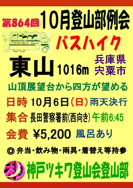 . 10月度の月例登山は 兵庫県宍粟市にある 東山 へ登ります。 東山は1,000m級の山ですが、コースがよく整備されているので、家族連れでも登れる山です。 麓には遊歩道、オートキャンプ場、湿原、温泉などもあります。 山頂には展望台が設けられていて、氷ノ山、一山、三室山、後山 などが見渡せます。 参加案内は 上に掲載のポスターの通りです。 クリックすると 拡大表示されます。 参加を希望される場合は こちらからではなく ホームページから 申し込
