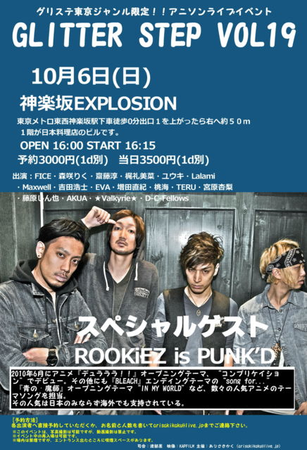 こんばんわ。 今週末日曜日10月6日(日)に、 神楽坂EXPLOSIONにて開催しますアニソンライブイベント GLITTER STEP VOL19のスペシャルゲストとして ROOKiEZ is PUNK’D さんがご出演くださいます。 ROOKiEZ is PUNK’Dさんのライブは、30分間ライブで、 16時オープン16時15分スタートで、 約17組のアニソン・特撮ソング歌うアーティストのライブが 続き、 ROOKiEZ is PUNK’Dさんのご出演時間は、21時過ぎからとなります。 イベント詳細は下記の通りです。 ■イベント名 GLITTER STEP voL19 ■イベントジ