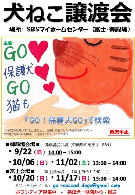 飼えなくても、ぜひ保護犬と触れ合いにきてください^^ ■■10/6(日)13:00〜14:00 犬ねこ譲渡会■■ @御殿場SBSマイホームセンター 御殿場市東田中1884 詳細 http://ameblo.jp/ntachi-to-sakura/entry-11628661060.html?frm_src=thumb_module