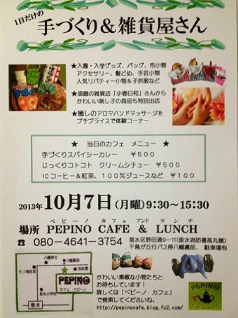 かわいい素敵な小物たちを並べた、1日限りの「手づくり&雑貨屋さん」♪ 古民家を改装したオシャレなカフェ「ペピーノ」。 当日は、イベント仕様のお得なカフェメニューも♡ 詳しくは「ペピーノ カフェ」で検索☆ http://pepinocafe.blog.fc2.com/ PEPINO CAFE&LUNCH 神戸市垂水区野田通9-11 (垂水高丸消防署横、千鳥が丘行バス停 八幡裏前) 駐車場有り