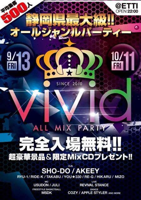 静岡最大集客 毎回500人over平均集客!! ☆★☆★☆★☆★☆★☆★☆★☆★☆★☆★☆★☆★☆★☆★☆★☆★☆★☆★☆★☆★☆ 静岡県内No.1の人気と集客を誇る鉄板オールミックスパーティーvivid!! 毎回500人overの動員!! 男女入場完全無料!! 今回も各種企画用意しております!! 今回のvividも盛り上がること間違いなし! ! もちろん今回も変わらず男女完全無料です!! 4年目に突入し更に進化し続けるvivid!!! 来たらわかる楽しさ!来なきゃ絶対に損!