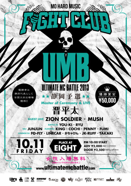 MO HARD MUSIC Presents 【FIGHT CLUB vol.67 × UMB静岡予選】 2013.10.11(FRI) @静岡CLUB EIGHT OPEN:22:00 ADV : 2000yen DOOR : 2500yen Lady's Freeeee!! [別途 入場時に500yen(1D)] [Master Of Ceremony&Live] 晋平太 [GUEST LIVE] ZION SOLDIER / MUSH [BATTLE DJ] YOU-KI / RYU [VDJ] JUNJUN [FLOOR DJ] KING / COCHI / PENNY / FUMI [LOUNGE DJ] FO-FLY / LINECAR / がちゃぴん / JK-RUFF / TAKAKI [前売りチケット取扱店] WATCHER 054-251-5656 ホルモンナイン 054-250-