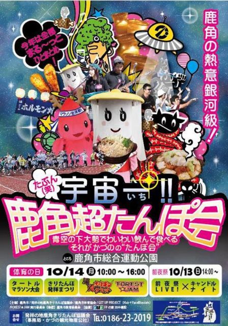 >10/14に鹿角超たんぽ会ってやるす。 >前夜祭がら始まって、スポーツの秋、食欲の秋、芸術の秋を一度に楽しめるイベントだす。 >それさ合わせで商品券だの特産品だのあだるキャンペーンも今日がら始まったがらみんな応募してけれす。 >10/14に「鹿角超たんぽ会」が開催されます。タートルマラソンや腸ホルモンサミット、ライブイベントなどを一度に楽しめます。イベントにあわせて宿泊商品券や鹿角の特産品があたるキャンペーンも始まりました。ふるってご応募ください。 >【写真:鹿角超たんぽ会ポスター】 > 応募期間⇒平成25年8月