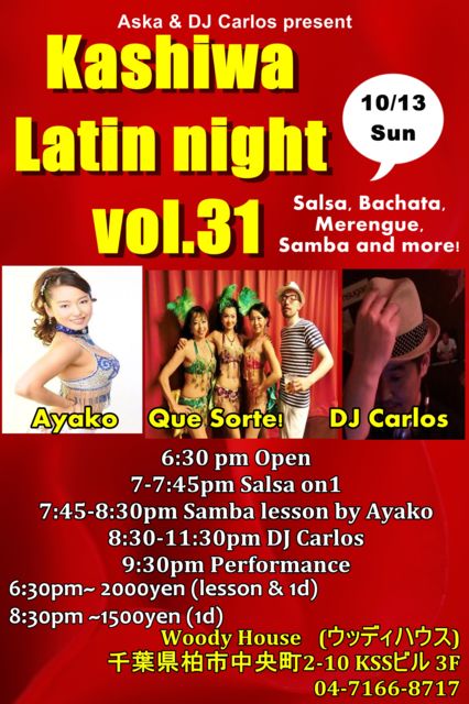 毎月大盛況柏のラテンパーティ!10月はスペシャルゲストAyako先生をお招きして、サルサのみならずサンバレッスン開催!初心者さんも経験者さんも楽しめる内容ですので、是非レッスンから遊びに来て下さいね。DJタイムはおなじみCarlosがサルサからサンバまでラテンの曲でフロアーを盛り上げます。ダンスパートナーや予約は不要です。