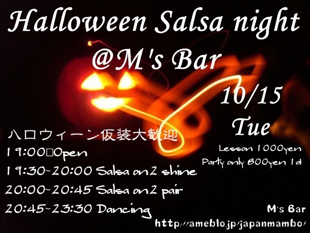 Salsa Night@南柏M's Bar 南柏でちょっと早めのハロウィーンパーティハロウィンハロウィン仮装大歓迎!ダンスが初めての方でも、サルサレッスンがありますので安心して遊びにいらしてくださいね。ON1やキューバンは踊れるけれど、ON2が初めて、という方も大歓迎☆レッスンの後はサルサ、メレンゲ、チャチャ、バチャタのリズムに乗って、飲んで踊って笑って、素敵な夜を過ごしましょう音譜アットホームなのでお一人でもお気軽にご参加下さい。 【日程】 10/15(火) 【時間】 19:00 オープン 19:30〜20:00 サルサNY on2 シャ