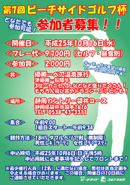 浜松ビーチサイドゴルフ倶楽部主宰の第7回本コースコンペです 今回の会場は静岡カントリー袋井コース 初参加の方も大歓迎 かなりの豪華賞品がそろってるので、 どしどし参加ボタンを押してくださいませ <日時> 10/16(水)9:00集合 1組目…9:34スタート <場所> 『静岡カントリー袋井コース』 静岡県袋井市国本1616 <プレー代> 9,700円(セルフ・昼食別) <コンペ参加費> 2,000円 <賞品> 優勝…ペア温泉旅行 準優勝…松阪牛 などなど <スコア集計方法> ダ