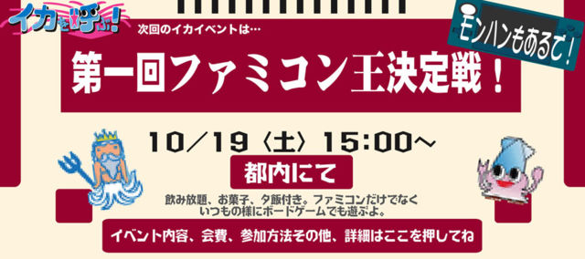 イカを呼ぶ!の月1イベント、10月はこれだ! 『第一回ファミコン王決定戦!モンハンもあるで!』 う〜! エンペラーズ!!でお馴染み"ゆりかん"が生まれた年に 世間ではファミリーコンピューター(ファミコン)が誕生しました。 そんなファミコン生誕30周年にちなんで、 今月はファミコンを中心にみんなでワイワイ遊ぼうと思います。 勿論、カセットを持ってる人がいたら是非持って来てくださいね( ̄∀ ̄)ノ そして今回、ハドソンキャラバンさながらの 「ファミコン王決定戦」なる企画もやります! 種目は当日までナイショです