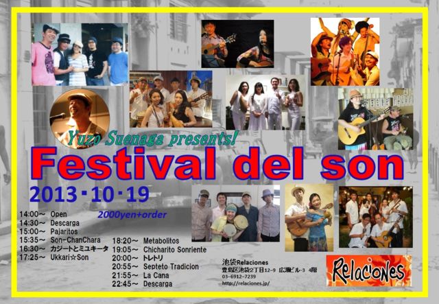 Cuba²»³Ú : SON ¤Îº×ŵ!! Yuzo Suenaga Presents ¡ÚFestival del Son¡Û ͹ë²Ú!! 9¥°¥ë¡¼¥×¤Î¶¥±é!! ¤Ä¤¤¤ËÍ褿¡ª¡ª¡ª ¥½¥ó¤ò°¦¤¹¤ëÃç´Öã¤ÈÌ´¤Î¶¥±é¡ª¡ª¡ª¡ª ¥È¥ì¥¹¤ÎÂè°ì¿Í¼ÔËö±Êͺ»°presents! ¥½¥ó¤Îº×ŵ¡÷ÃÓÂÞRelaciones ¤Ê¤ó¤È9¥°¥ë¡¼¥×¤¬½Ð±é¡ª¡ª ÃÓÂÞ¥ì¥é¥·¥ª¡¼¥Í¤ÏåºÎï¤Ç¤ª¼ò¤Ï¤â¤Á¤í¤ó¡¢¤ªÎÁÍý¤Ë¤âÄêɾ¤Î¤¢¤ë¤ªÅ¹¡ª¡ª¡ª ¥É¥ê¥ó¥¯¤â¥Õ¡¼¥É¤â¡ï£µ£°£°¡Á¡×¡ª ¥¿¥³¥é¥¤¥¹¤ä¥°¥ê¡¼¥ó¥«¥ì¡¼¤Ï¿ôÎ̸ÂÄê¤Ê¤Î¤ÇÁ᤯Íê¤Þ¤Ê¤¤¤È¤Ê¤¯¤Ê¤Ã¤Á¤ã¤¦¤è¡ª 14:00¡Á¡¡¡¡¡¡Open 14:30¡Á14:50 Openning Descarga 15:00¡Á15:20 Pajaritos