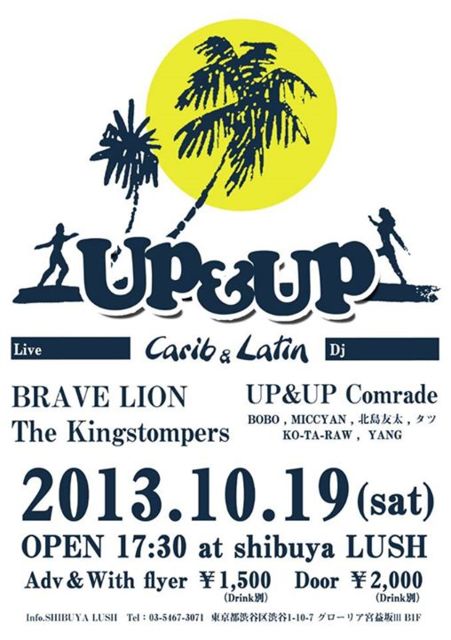 ¡ÖUP&UP¡× 10/19(ÅÚ) @ ½ÂëLUSH OPEN 17:30 ADV¡õwith flyer ¡ï1500(DrinkÊÌ) DOOR ¡ï2000(DrinkÊÌ) ¡ÎLIVE¡Ï BRAVE LION The Kingstompers ¡ÎDJ¡Ï UP&UP Comrade (BOBO/MICCYAN/ËÌÅçͧÂÀ/TATZ/KO-TA-RAW/YANG) ¡ÎInfo¡Ï http://www.up-a-up.net/