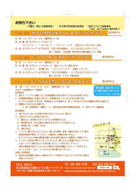 10·î19¡¦20Æü ËëÄ¥¿·ÅÔ¿´¤ÎÃæ¿´¤Ë°ÌÃÖ¤¹¤ë¡¢¤ß¤É¤ê¤È³¤¤Î¥·¥Æ¥£¥Ñ¡¼¥¯¤ò¥Æ¡¼¥Þ¤È¤·¤¿¸ø±à¡Ø¸©Î©ËëÄ¥³¤É͸ø±à¡Ù¤Ç2013ǯ10·î19Æü¡ÊÅÚ¡Ë¡¦20Æü¡ÊÆü¡Ë¤Î2Æü´Ö¡¢¥É¥Ã¥°¥é¥ó¥¤¥Ù¥ó¥È¤¬³«ºÅ¤µ¤ì¤ë¡£ ÅöÆü¤Ï¡¢Ìó3¥Ø¥¯¥¿¡¼¥ë¤ÎÂç¼ÇÀ¸¹¾ì¤Î¤¤ì¤¤¤Ê¼Ç¤Ë¡¢¥É¥Ã¥°¥é¥ó¤ò2¶è²è¡Ê¾®·¿¡¦Ãæ·¿¥¨¥ê¥¢¤ÈÂç·¿¸¤¥¨¥ê¥¢¡ËÀßÃÖ¡£ ¤Þ¤¿10·î19Æü¡ÊÅڡˤÏÃϸµ¤ÎÀìÌç³ØÀ¸¤Ë¤è¤ë¡Ø¥Ú¥Ã¥È¥±¥¢¥µ¡¼¥Ó¥¹¡Ù¤Ë¤è¤ë̵ÎÁ¥Ú¥Ã¥È¥±¥¢¡Ê1¥±¥¢¡Ë¡¢10·î20Æü¡ÊÆü¡Ë¤Ï¥Ú¥Ã¥È¥±¥¢¥µ¡¼¥Ó¥¹¥«¡¼¤Ë¤è¤ë̵ÎÁ¥Ú¥Ã¥È¥±¥¢¡Ê1¥±¥¢¡Ë¤Î¤Û¤«¡¢°¦¸¤»£±Æ²ñ¡¢¥°¥Ã¥º¥Þ¡¼¥±¥Ã¥È¡¢ÌµÎÁ¤·¤Ä¤±ÁêÃÌ¡¢¥Õ¥é¥¤