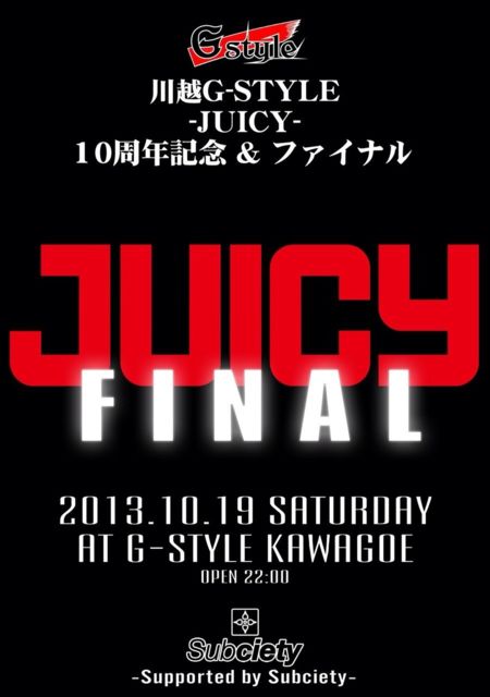 -JUICY FINAL- 2013.10.19 Ëè²ó¤«¤Ê¤ê¤Î¤ªµÒÍͤˤò±¿¤ó¤Ç夤¤Æ¤ª¤ê¤Þ¤¹¡£ º£²ó¤Ç10¼þǯ¤ò·Þ¤¨¤ëJUICY!!!! ¤½¤·¤Æ¡¢FAINAL!!!!! ºë¶Ì³ÆÃϤÇJUICY¤È¤¤¤¦Ì¾¤òÃΤé¤Ê¤¤¿Í¤Ï¤¤¤Ê¤¤¤¯¤é¤¤BIG PARTY¤Ç¤¹!!!! º£¤Þ¤Ç¤Î½¸ÂçÀ®¤Ç¤¢¤êº£¤Þ¤Ç°Ê¾å¤Ë°ìÈÖÀ¹¤ê¾å¤¬¤ë¤È»×¤¤¤Þ¤¹¡ª¡ª¡ª¡ª º£²ó¤ÎGUEST DJ¤Ï¤³¤ÎÊý!!!!!!! DJ KANGO !!!!! ¤ÎÅо졣FINALÀ¤³¦´ð½à¤ÊDJ¤ò!! À§Èó¡¢Â䶤·¤Æ²¼¤µ¤¤¡£¤½¤·¤Æ¡¢JUICY¤Î»ý¤ÄPARTY´¶¤È¤ÎÍ»¹ç¤ò³Ú¤·¤ß¤Ë¤·¤Æ²¼¤µ¤¤¡£ ¤µ¤é¤Ë¡¢ÀèÃå¤ÇSupport¤·¤ÆÄº¤¯SUBCIETY ¤«¤é ¡ú¥ª¥ê¥¸¥Ê¥ë¥é¥Ð¡¼¥Ö¥ì¥¹¥ì¥Ã¥É