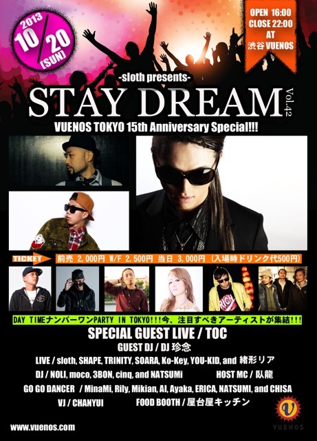 管理人様告知失礼します。 不適切でしたら削除お願いします。 ※※チケットがいよいよeプラスにて発売開始致しました!※※ パソコンからの購入はコチラをクリック →http://p.tl/yzM0 iPhone等、スマホからの購入はコチラをクリック →http://p.tl/5V1z 「DAY TIMEのCLUB EVENT」とは思えない動員数と盛り上がりを誇るSTAY DREAM! そんなSTAY DREAMがVUENOS15周年とのコラボ! ゲストライブには言わずと知れた「MC TOC」!! ソロとして10/4発売のシングル「BirthDay / Atonement」リリース以降東京では初ライブとなります