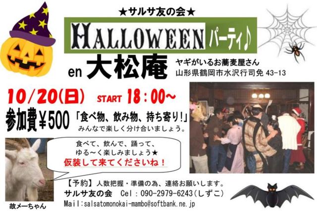 サルサ友の会☆まったりハロウィン、今年も開催! 10/20(日)大松庵 18:00〜 参加費¥500 食べ物・飲み物など持ち寄り! ハロウィンなので、仮装して来て下さいね☆ 人数把握の為、参加の方はしずこまで御連絡下さい