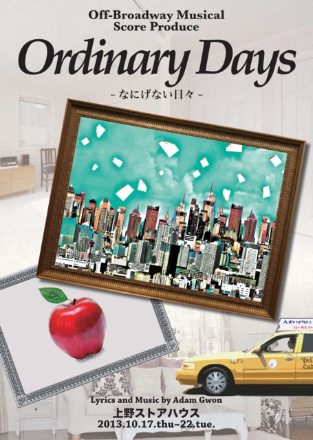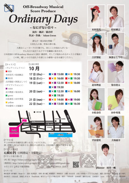 ÌÚ¼²ÖÂ夵¤ó¡¢µÈÂôÍü³¨¤µ¤ó¤¬½Ð±é¤·¤Þ¤¹¡£¤â¤·µ¹¤·¤±¤ì¤Ð·à¾ì¤Ë¤ò¤ª±¿¤Ó²¼¤µ¤¤¡ª Score Produce Off-Broadway Musical ¡ØOrdinary Days ¡Á¤Ê¤Ë¤²¤Ê¤¤Æü¡¹¡Á¡Ù ï¤â¤¬°ìÅÙ¤ÏǺ¤àÌäÂê¡Ä ÂçÀڤʿͤΤ³¤È¡¢¾Íè¤ÎÌ´¤Î¤³¤È¡£ ÂçÅÔ²ñ¥Ë¥å¡¼¥è¡¼¥¯¤ÎÊÒ¶ù¤Ç¤â¡¢Æ±¤¸¤³¤È¤òǺ¤à¿Í¤¬¤¤¤ë¡Ä¤½¤ó¤ÊÆü¡¹µ¯¤¤¦¤ë¥É¥é¥Þ¤òÁ¡ºÙ¤ËÉÁ¤½Ð¤¹¡£ ÆüËܽé±é¤ÎOff-Broadway Musical¤Ë±é½Ð¡§Æ£ÁÒ°´¡¢¤½¤·¤ÆºÍǽ¤¢¤Õ¤ì¤ë¥¥ã¥¹¥È¤¬½¸·ë¡ª ¤³¤Î½©¡¢Í¥¤·¤¤¾®¤µ¤Ê²¹¤â¤ê¤ò´¶¤¸¤Ë¾®·à¾ì¤ØÂ¤ò¤ª±¿¤Ó¤¯¤À¤µ¤¤¡£ ¡ý±é½Ð¡¦Ìõ»ì¡¡Æ£ÁÒ°´ ¡ýºî»ì¡¦ºî¶Ê¡¡Adam Gwon