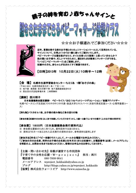 管理人様 いつも貴重な場にお知らせをさせていただきありがとうございます。 健康・子育て・生涯学習サークルW-projectでは、 子育て支援事業として、赤ちゃんとの生活に関わる様々なプログラムを提供しております。 北海道は秋冬にかけてとても寒くなり、 なかなか服を脱がせてオイルベビーマッサージするのが 抵抗がある季節になります。 そんなときに、「服を着たままできるベビーマッサージ」はいかがですか? 親子のコミュニケーションツールとして注目の赤ちゃんサインと同時開催です。 ぜひこの機会にお誘い合わせの上、ご参加くだ