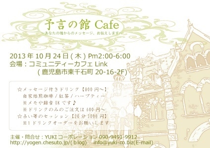 カジュアル、ナチュラル、スピリチュアルをモットーにお客様の魂からのメッセージを伝える予言の館cafeが不定期オープン。 希望に満ちた人生となりますように!! 10/24(木)Open 2:00pm - Close 6:00pm (LO 5:30pm) 会場:コミュニティーカフェLink (鹿児島市東千石町20-16 りんくビル2階) ・予言料800円〜(ドリンク付き) ※メモや録音OK ※スタッフによるセッションも有り。 詳しくはblogにて http://yogen.chesuto.jp/ 主催:YUKIコーポレーション cafe@yuki-co.biz http://yuki-co.biz/