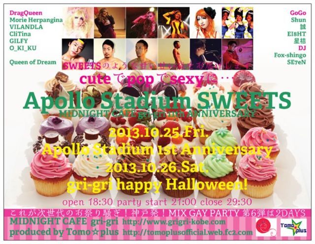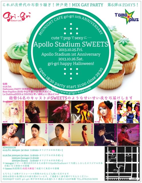 Apollo Stadiumu vol.6 二夜連続開催の初日はアポロスタジアム1周年パーティーですよ〜〜ぉ 初日から甘〜いパーティーでお楽しみくださいね〜 ご来場お待ちしております☆☆ 神戸市中央区山本通3-3-1 燕京ビル B1 MIDNIGHT CAFE gri-gri 18:00open 21:00party start 29:30close Admission 1,800yen / 1drink + オリジナル手拭い(翌日持参されますと500offになります) Cast DJ.SE7eN / Fox-shingo DQ.Morie Herpangina / O_KI_KU GoGo.誠 / Shun / EI8HT / Tomo-Nobu 詳細はこちらからご確認ください ↓↓ http://www.g