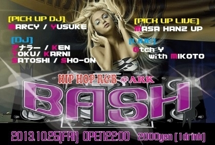 2013.10/25(金) 毎月第4金曜日 【BASH】 水戸@ARK 【PICK UP DJ】MARCY / YUSUKE 【PICK UP LIVE】MASA HANZ UP <DJ> アナラー/SATOSHI/SHO-ON/TOKU/ KEN /KARNI <LIVE> OtchY with MIKOTO open 22:00 ~ ¥2000(1D) CLUB ARK毎月第四金曜日開催のレギュラー イベント 「BASH」 各方面で活躍しているDJ/RAPPER/SINGER/DANCERが 毎月第四金曜日CL UB ARKに集結して皆で「BASH」しちゃいま す!! ジャンルに関してはルーツは「HIPHO P」というだけで この大勢のメンバーだから 出来る最近の新譜から旧譜、 アンダーグラ ウ