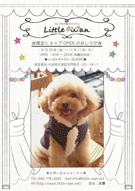 *10月の限定ショップのお知らせ* みなさまこんにちは!Little wanデザイナーの大澤です☆ 今日は、またまた限定ショップOPENのお知らせです。 8月に開催しました「2日間限定ショップ」が大好評で お客様よりもっと長い期間での出店してほしいとのお声を頂きまして 今回、16日間の犬服ショップをオープンする運びとなりました! 実際にワンちゃんと一緒にお越しいただき、フィッテングも可能ですので 是非遊びにいらして下さい。 【日時】 2013年10月25日(金)〜11月11日(月) OPEN:13:00〜CLOSE:20:00(木