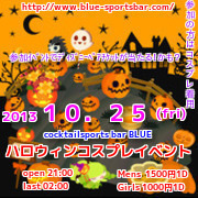 来週の25(金)は、BLUE恒例のハロウィンコスプレパーティーやりますよ! みなさんなにかしらのコスプレをしてご参加ください。 BLUEにまだ来た事ないお客様も気軽に遊びにきてくださいね。 ★ディズニーリゾートペアチケットの当たるイベントも開催しますよ。当たった方はかなりお得ですよ!ディズニー好きも是非!!! メンズ 1500円(1ドリンク) レディース 1000円(1ドリンク) http://www.blue-sportsbar.com/