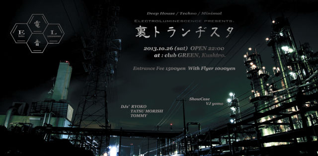 ¢öHOUSE/TECHNO/etc. <10/26(sat) OPEN 22:00> ¡ÁElectroLuminescence¡Á ¡Ú΢¥È¥é¥ó¥Â¥¹¥¿¡Û 2013-10-08 23:45:35-1 **RESIDENT DJs** RYOKO/TATSU MORISH/TOMMY **VJ ** yomo [door 1500yen][W/F 1000yen]