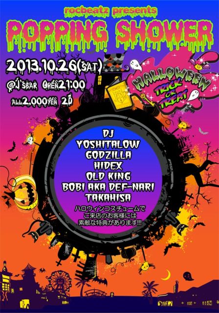 POPPING★HALLOWEEN★SHOWER (TOP40,EDM,HIP HOP,R&B) 10月26日 第4土曜日 山形唯一のHALLOWEEN PARTY!! 是非、仮装してお菓子持ってみんなでHALLOWEENを楽しみましょう☆ @J'sBAR (山形駅前ホテルイーストワン地下) OPEN 21:00〜 Blogやfacebook.mixi画面提示で 1500円2Dにディスカウント ※提示の無い方は2000円2ドリンク込み ポピシャコミュ http://mixi.jp/view_community.pl?id=2786892& rocbeatzアメブロ http://s.ameblo.jp/ps-rocbeatz/ rocbeatz facebook http://www.facebook.com/rocbeatz.po