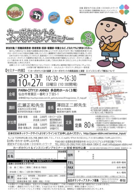 カーボカウント&インスリンポンプセミナー in 宮城 皆さんご承知のように食後の血糖値は炭水化物によって大きく左右されます。 特に1型糖尿病患者のためのカーボカウントはこの炭水化物量に注目したインスリン量調節法で、欧米ではその有用性が実証され普及しています。 日本ではまだ十分に普及していませんが、超速効型インスリンの作用時間が炭水化物の血糖上昇時間に適合することからカーボカウントの重要性が高まりました。日本の料理は多様で複雑なことからカーボカウントは難しいという面があります。反面、日本の食事は欧米に比較して炭水化