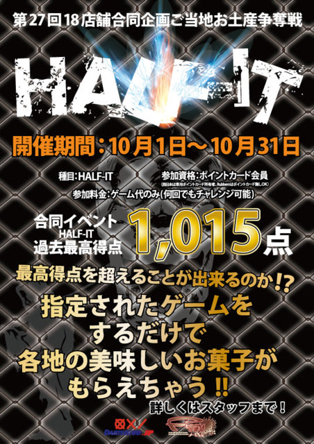 皆さんお待ちかね!!偶数月!! 10月はいったい誰がご当地お土産をGETするのか!? 10月の種目は HALF IT!! 高得点を狙って店舗1位を目指すも良し!! 回数をこなしてキリ番を狙うも良し!! 楽しくプレイしてご当地お土産をGETしちゃいましょう(^O^)/ みなさんのご参加ドシドシお待ちしております(*^^)v