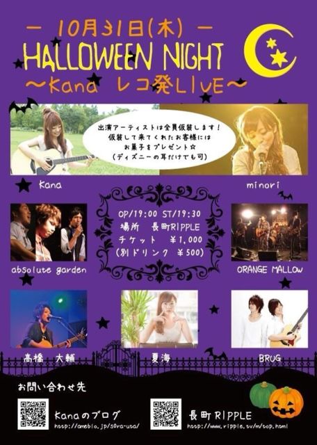 Kana presents Halloween Night 〜kanaレコ発LIVE〜 OPEN/19:00 START/19:30 TICKET 前売/¥1000 当日/¥1500 w/ Kana / ORANGE MALLOW / 夏海 / 高橋大輔 / absolute garden 出演アーティスト全員は全員仮装します! 仮装して来てくれたお客さまにはお菓子をプレゼント☆ (ディズニーの耳だけでも可) ※ブルグ出演予定時間⇒ 22時00分〜 タイムテーブル 19:30★夏海(岩手) 20:00★ORANGE MALLOW 20:30★高橋大輔 21:00★kana 21:30★absolute garden 22:00★BRUG(東京)