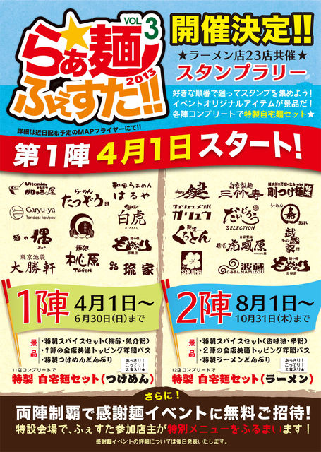 ●ノビる前に駆けつけろ!! らあ★麺 ふぇすた!! vol.3 ●ラーメンインフォのコーナーでも既にお伝えしている沖縄のラーメン店 23店によるスタンプラリーが4/1より始まります。 (上の開催日時を4/1にすると募集期限も4/1までになってしまう関係で 最終日の 10/31としています。) ●今回は初陣、2陣と2回に分けられており、初陣は4/1より6/30まで、2陣は 8/1より10/31までとなっています。 参加店でラーメンを一杯食べるたび、スタンプが 1個押印され、獲得した スタンプ数によって数種類のオリジナルグッズが もらえるというラーメン