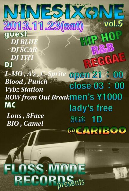 Floss Mode Records presents 「Nine Six One」 vol.5 2012.11.23 (sut) @ Cariboo Man 1000 + 1d Lady Free Open. 21:00 Close.03:00 Guest. DJ BLUE DJ SCAR DJ TITI DJ L-MO A's C-Sprite Blood Punch Vybz Station Row from OUT BREAK MC Lous 3Face BIO Camel