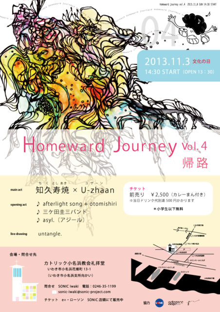2013年11月3日(日)いわき カトリック小名浜教会礼拝堂 Homeward Journey 帰路 Vol.4 http://homewardjourney.businesscatalyst.com/vol.4-のこと.html 知久寿焼 × U-zhaan afterlight song + otomishiri 三ケ田圭三バンド asyl. 13:30/14:30 2500円(カレーまん付き)+ドリンク500円 発売中。くわしくは上記サイト、下記チラシ画像をご参照ください。 http://u-zhaan.com/schedule/images/帰路04フライヤ_修正0730_0001.jpg :::::::::::::::::::::::::::::::::::::::::::::::::::::::::::: 以上、知久寿焼website(http://