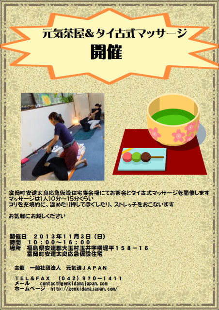 元気茶屋&タイ古式マッサージ開催 富岡町安達太良応急仮設住宅 開催日 2013年11月3日(日) 時間 10:00〜16:00 場所 福島県安達郡大玉村玉井字横堀平158−16 富岡町安達太良応急仮設住宅集会場