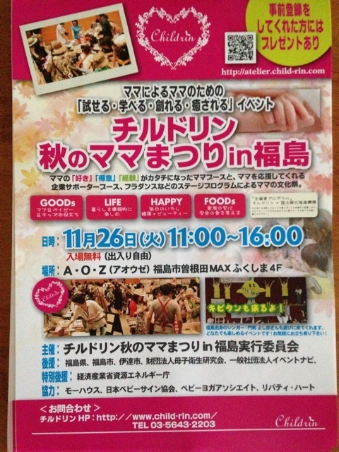 福島で開催されるママのためのママによるイベント ママまつりin福島開催!! 日時:11月26日(火) AM11:00〜PM4:00 入場無料!出入り自由! 場所:A・O・Z(アオウゼ) で開催されます 。 ※おむつ替え・授乳スペース設置 ママまつりとは・・・ ママによるママのための文化祭。運営もボランティアのママが行い、 カラーセラピー、ヨガ、アロマ、ベビーサイン、などなど 他にもママ向け・赤ちゃん向けサービス・情報のブースが多数出店! 今年の福島は50ブース以上の出展が予知されています!! 今年は全国2