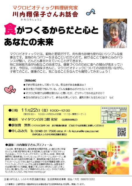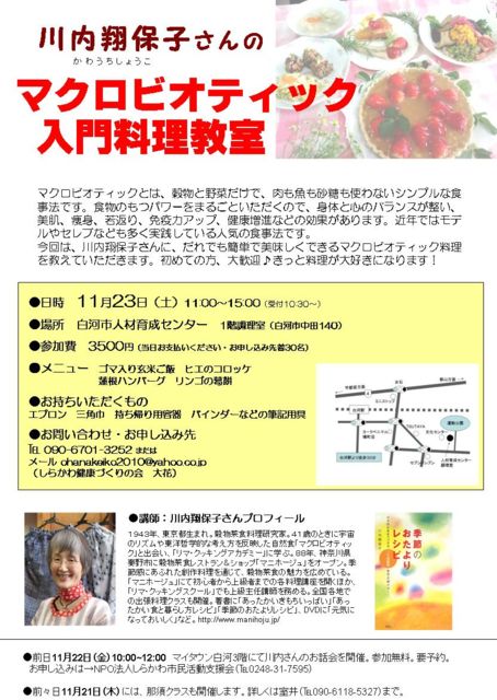 こんにちは、NPOしらかわ市民活動支援会の大花といいます。 下記の通り、イベントを開催しますので、よろしければご参加ください。 食がつくるからだと心とあなたの未来 マクロビオティックとは、穀物と野菜だけで、肉も魚も砂糖も使わないシンプルな食事法です。食物のもつパワーをまるごといただくので、続けることで身体と心のバランスが整い、どんどん夢を叶えていくことができます。 特に放射能汚染が心配なこの地域では、健康づくりのために食への関心が高まっています。今回は、川内翔保子さんに、マクロビオティックについてのお