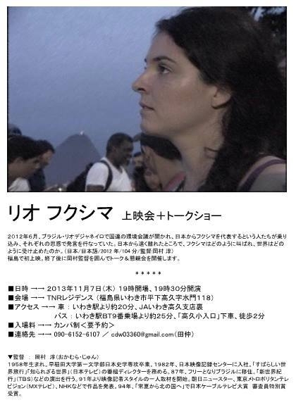 地元からの要望をいただき、福島県いわき市で『リオ フクシマ』の上映とトークを行なうことになりました。 準備の都合上、参加希望の方は予約をお願いします。 日時 西暦2013年11月7日(木)19時開場19時半開始 場所 TNRレジデンス(いわき市下高久字水門118) アクセス 自動車:いわき駅より約20分、JAいわき高久支店裏 バス:いわき駅BT9番乗場より約25分、「高久小入口」下車徒歩2分 カンパ制・要予約 予約および問合せ:電話090-6152-6107 cdw3360@gmail.com (田仲さん宛て)