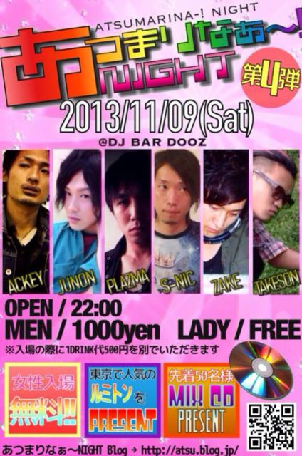 女性入場無料! ヒット曲てんこもりの100人規模のお祭りパーティー! あつまりなぁ〜NIGHT!第4弾 場所 DJ BAR DOOZ 日付 2013.11.09(土) 時間 午後10時から 料金 男性1,000円 女性無料 ※入場の際にドリンク代500円をいただきます DJs ACKEY JUNON S-NIC ZAKE CHIHiRO TAKESON MC PLAZMA 毎回大盛り上がりでリピーターの多いあつまりなぁ〜NIGHT! 寒さを吹き飛ばす熱いナンバーでクラブ初心者から上級者まで誰でも楽しめる内容でお届けします! しかも当日は先着50名様にオリジナルmixC