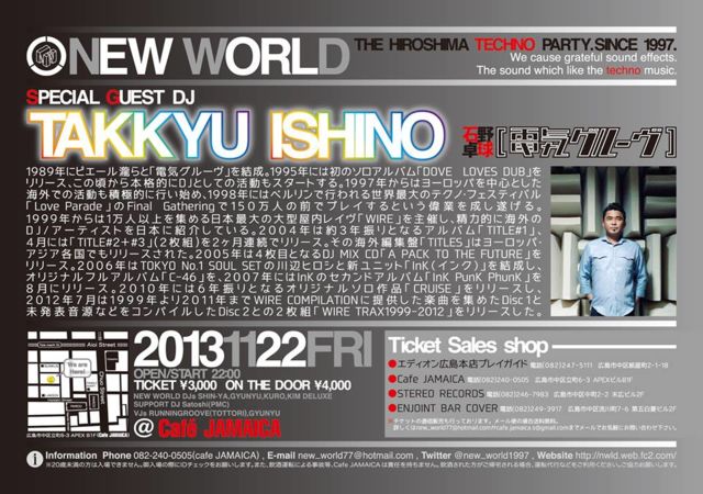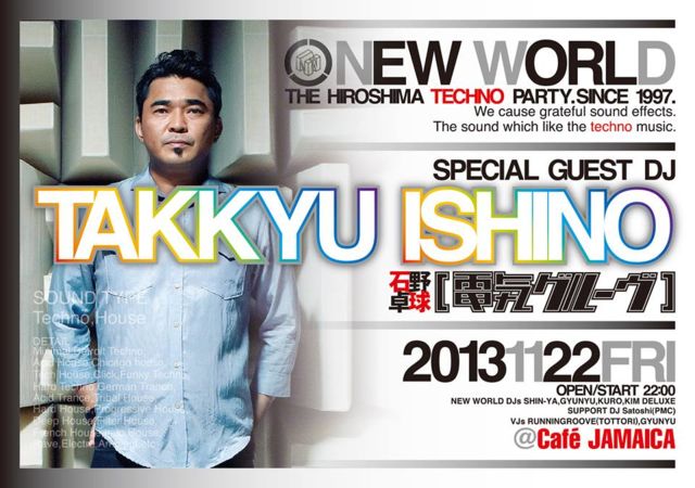 『もはや説明不要!ジャパニーズテクノシーンの第一人者、電気グルーヴの"石野卓球"がNEW WORLD(@Cafe JAMAICA広島)に出演決定!』 国内のみにとどまらずヨーロッパを中心に海外でも積極的にDJ活動を行い、ベルリンで開催された世界最大のテクノ・フェスティバル「Love Parade」 では150万人の前でプレイ。 その他数々の偉業を成し遂げたのち、言わずと知れた国内最大の大型屋内レイヴ「WIRE」を主催。今年で15周年を迎えた。 時代に媚びない新旧テクノ、ハウスミュージックを軸に幅広い選曲を織り交ぜながら作り出す独自の世界観は、普段あ