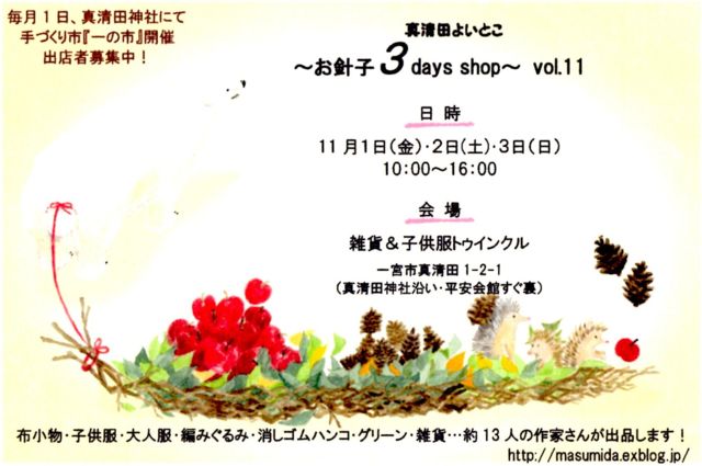 真清田よいとこ〜お針子3days shop〜vol.11 ゚・*:.。..。.:*・゚゚・*:.。..。.:*・゚゚・*:.。..。.:*・゚゚・*:.。..。.:*・゚ 日 時★11月1日(金)〜 3日(日)午前10〜午後4時 会 場★雑貨&子供服トゥインクル 一宮市真清田1-2-1(真清田神社沿い・平安会館すぐ裏) ゚・*:.。..。.:*・゚゚・*:.。..。.:*・゚ ゚・*:.。..。.:*・゚゚・*:.。..。.:*・゚ 今回は平日金曜日(1日)スタート! それには訳があり… 毎月1日、真清田神社で手づくり市『一の市』が始まりました。 (1月を除く3月まで) 真