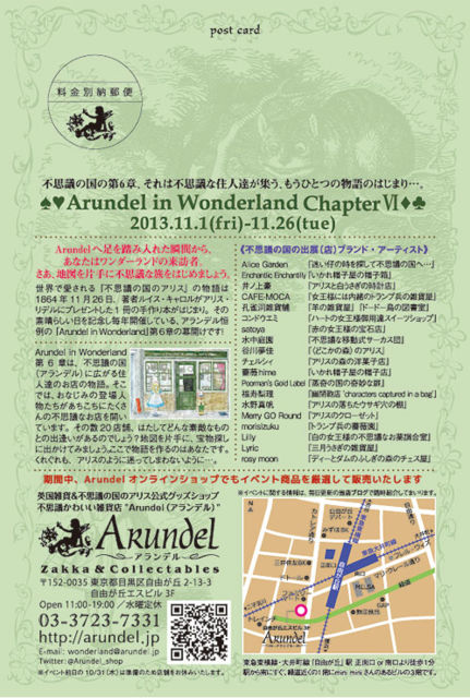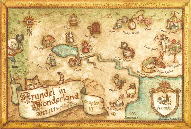 不思議の国の第6章、それは不思議な住人達が集う、もうひとつの物語のはじまり…。 【Arundel in Wonderland Chapter 6】 ◎期間:2013.11.1(金)〜11.26(火) ◎場所:Arundel 自由が丘店 《Arundelへ足を踏み入れた瞬間から、あなたはワンダーランドの来訪者。さあ、地図を片手に不思議な旅をはじめましょう。》 世界で愛される『不思議の国のアリス』の物語は1864年11月26日、著者ルイス・キャロルがアリス・リデルにプレゼントした1冊の手作り本がはじまり。その素晴らしい日を記念し毎年開催している、アランデル恒例の『Arundel in