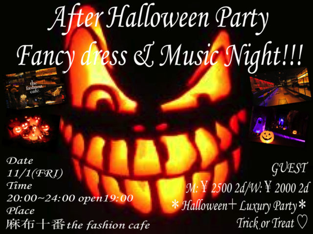 After Halloween Party Fancy dress & Music Night!!! 1日遅れのHalloween Night♪仮装をもっと楽しみたい!!ミュージックを楽しみたい!! 仮装あり、ドレスコードありファッション&ミュージックを楽しむ遊び人が集まるパーティー 更に、今夜限りのコラボ YG×SM サウンド夢のコラボも… Date 11/1(FRI) Time 20:00~24:00 open19:00 ※居残り可 Place 麻布十番the fashion cafe http://www.tokyo-club.net/f-bar/ 南北線、大江戸線 麻布十番駅 7番出口徒歩1分 ENTRANCE 一般 DOOR M4000 1d W:3000 2d GUEST 招待