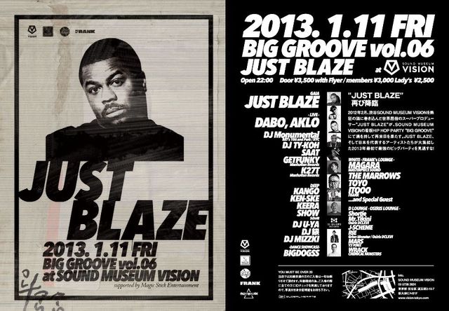 1/11(金) "JUST BLAZE"再来日決定!! 2012年2月の来日で渋谷SOIUND MUSEUM VISIONを大いに湧かせたJUST BLAZEが来日決定! SOUND MUSEUM VISIONのHIP HOP PARTY "BIG GROOVE"に登場!! 渋谷のHIP HOPに湧かせる事間違いなし。2013年まだまだ続くBIG GROOVEの波に乗れ!! ★☆★☆★☆★☆★☆★☆★☆ ゲストお取り出来ますので、お気軽にお問い合わせ下さい。 また、エントランスにて 『ユウヤのゲストでピーチ』 と言って頂ければ、何名様でもゲスト料金にてご入場頂けますのでお使い下