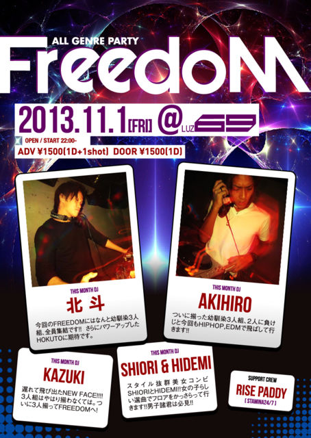 FREEDOM 2013 vol.11 [ALL GENRE] ■2013.11.1(Fri) ■OPEN/22:00 ■ADV /1500(1D+1shot) ■DOOR/1500(1D) ■@LUZ69 ■DJs ・HOKUTO (今回のFREEDOMにはなんと幼馴染3人組、全員集結です!! さらにパワーアップしたHOKUTOに期待です) ・AKIHIRO (ついに揃った幼馴染3人組、2人に負けじと今回もHIPHOP,EDMで飛ばして行きます!!) ・KAZUKI (遅れて飛び出たNEW FACE!!!! 3人組はやはり揃わなくては。ついに3人揃ってFREEDOMへ!) ・SHIORI & HIDEMI (スタイル抜群美女コンビ SHIORIとHIDEMI!! 女の子らしい選