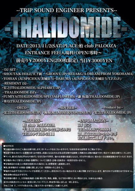 --TRIP SOUND ENGINEER PRESENTS-- -THALIDOMIDE- DATE:2013/11/2(SAT) OPEN:Îí»þ¡Á PLACE:Çð club PALOOZA ENTRANCE FEE(Æþ¾ìÎÁ) Á°Çä¤ê¡ï2000YEN(200Ëç¸ÂÄê) ÅöÆü¡ï3000YEN --DJ SET-- ¡¦SHOUTA(K-HOLE/Å·²¼Åý°ì/GROOVE/JP) ¡¦REI(A&G/A-DREAM/FROM YOKOHAMA) ¡¦YOSSAN (AUSPICIOUS/°ñ¾ë¶¸¤¦) ¡¦DARUMA (AUSPICIOUS/°ñ¾ë¶¸¤¦/T.F.O.P.) --RESIDENT DJ-- ¡¦¹¨Ç·(THALIDOMIDE/ALPHABET/JP) --THALIDOMIDE DJ's-- ¡¦FUMIYA(THALIDOMIDE/SPECIALFLOWERS) ¡¦¸¬ ºäÉô(THALIDOMIDE/JP) ¡¦²Ú·î(THALIDOM