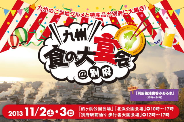 九州の各地域が誇る食材・郷土料理・食文化など、“食”をテーマにしたまちおこし・地域活性化の活動を、ここ別府から九州・全国に発信するイベントです。 イベントの主役は、九州各地の生産者さんや事業者さん。 一生懸命育てた・作ったものをお披露目・販売します。 そんな各地域自慢の“食”の数々をワイワイガヤガヤ、楽しく愉快におたのしみください!