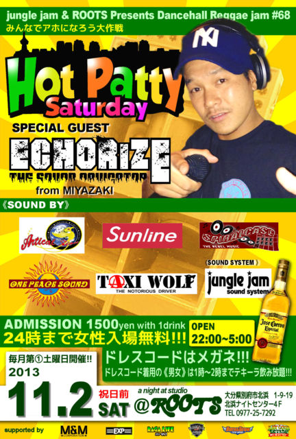 【大分県・別府市】Hot Patty Saturday #68 24時まで女性入場無料!!!!!!!!! 第68回目のゲストは宮崎からエコライズ! 日本語とパトワを巧みに使い分け常に現場を沸かすセレクトで、現場をガッチリ盛り上げてくれるエコライズが宮崎からやってくる〜!!!! そして68回目のドレスコードはメガネ!!?なにー!!!? ドレスコード着用の男女は1時から2時までテキーラ飲み放題!!!!!!!!!!!!!!!! キンキンに冷えたテキーラと爆音でお待ちしています!!! SPECIAL GUEST ECHORIZE from 宮崎 SOUND Ar